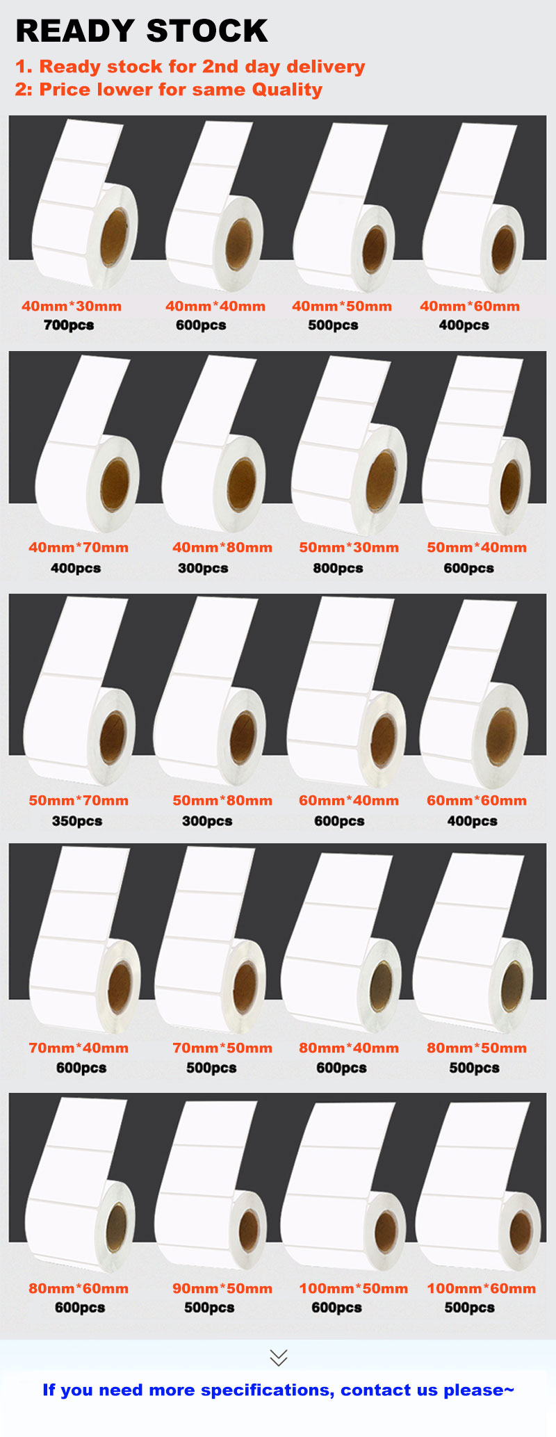 Regular Size4"x6",2"x1",100x150mm,60x40mm,58x40mm 50x25mm,...etc.or as your requirement
